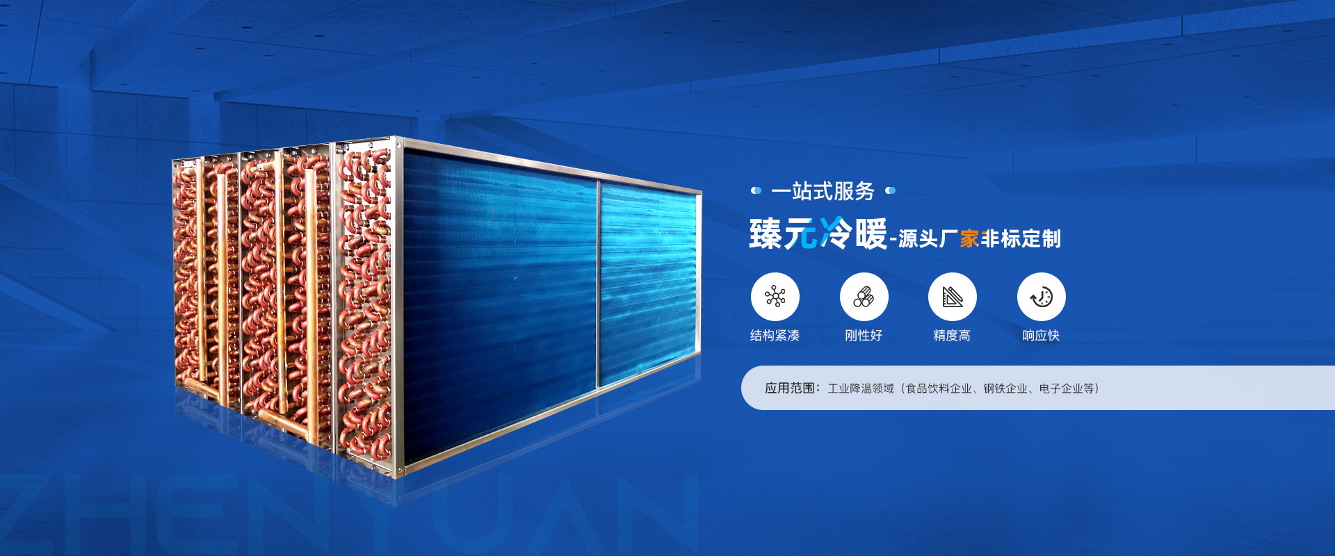 臻元冷暖自成立以来,始终坚持掌握市场动向,打造核心技术竞争力的战略方针,依靠强有力的技术团队,采用现代化加工设备和技术力量,为客户提供满意的解决方案;产品在冷水机、制冰机、中央空调、电子厂、纺织厂、食品厂、工业洗涤等行业广泛营业并得到客户的认可。